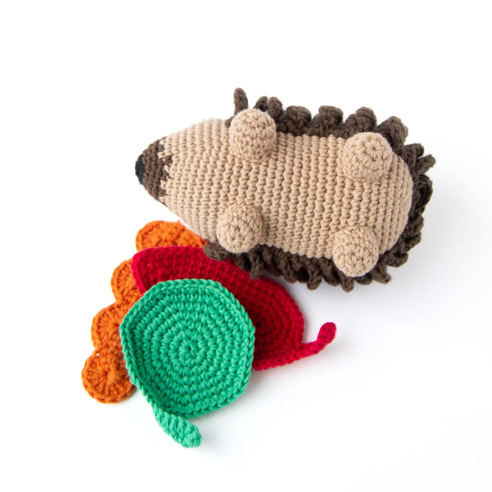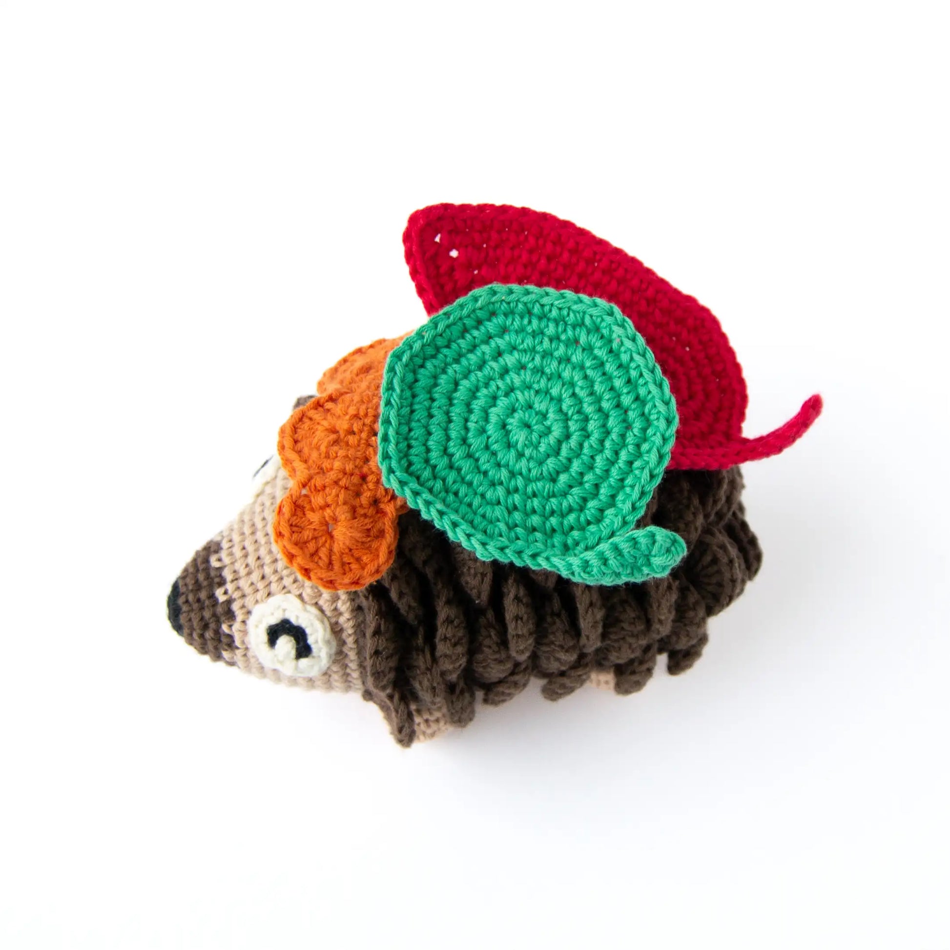 Henry is a 13 cm long crocheted hedgehog with four tiny feet and a pair of happy eyes. Henry loves to play with his leaves and dreams about a leaf mountain where he can cuddle up during winter.