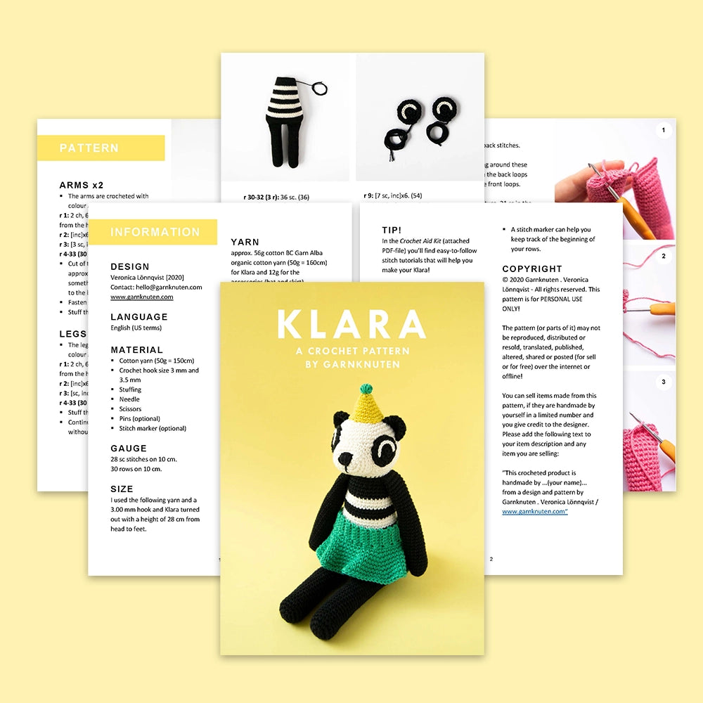 All Garnknuten patterns are easy to follow and have a pedagogical beginner-friendly design. The Klara the panda pattern is a downloadable PDF with step-by-step instructions and helpful pictures that will smoothly guide you through the making process. Leaving you creative and inspired for your next amigurumi project!