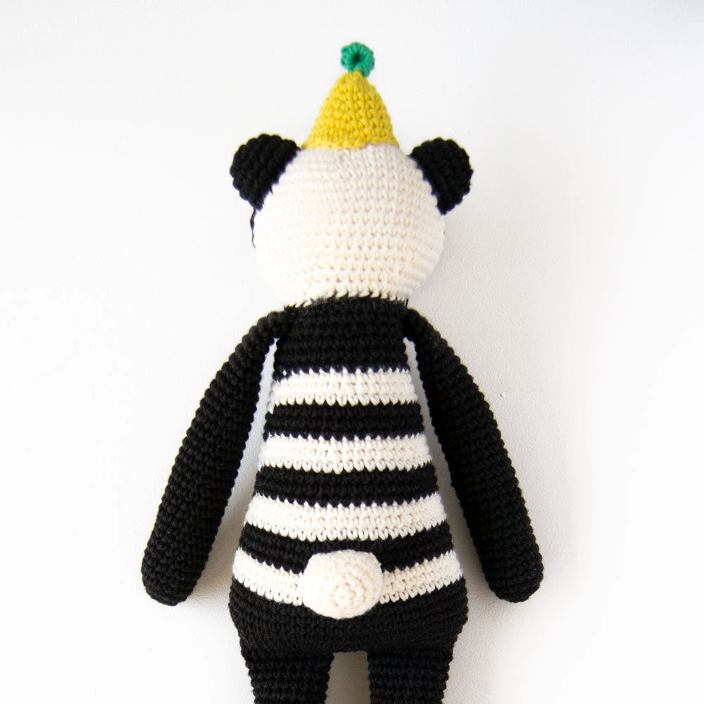 Crochet your own adorable amigurumi panda with this downloadable crochet pattern for Klara the panda. Klara is a 30 cm crocheted panda with stripes and a party hat. Klara the panda makes the perfect gift and lights up any child's (or adult's) room!