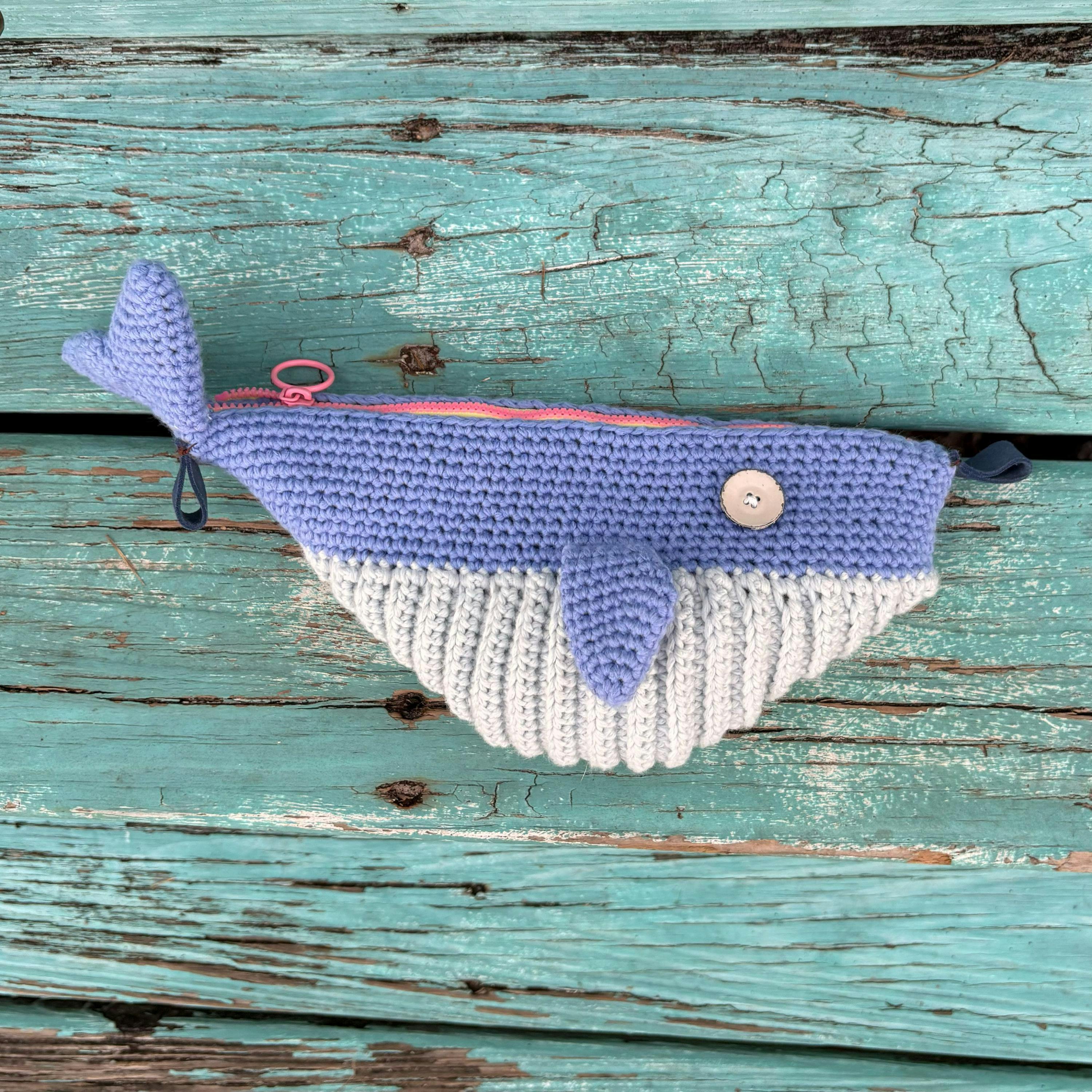 Crochet your own adorable whale bag or pouch with this downloadable PDF crochet pattern. Wally is a practical whale with happy eyes, a cute pink lining and a zipper. The bag is 26 cm wide and 12.5 deep and the pouch is 19 cm wide and 9 deep.