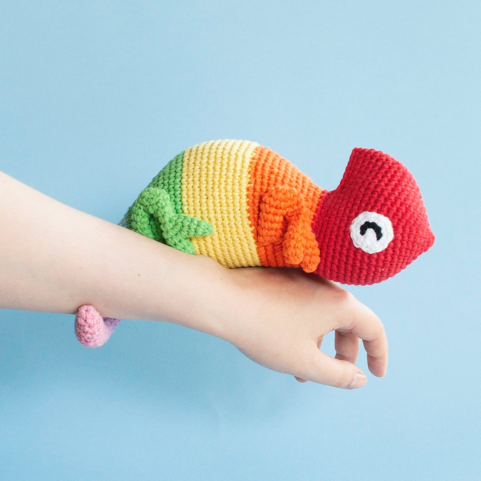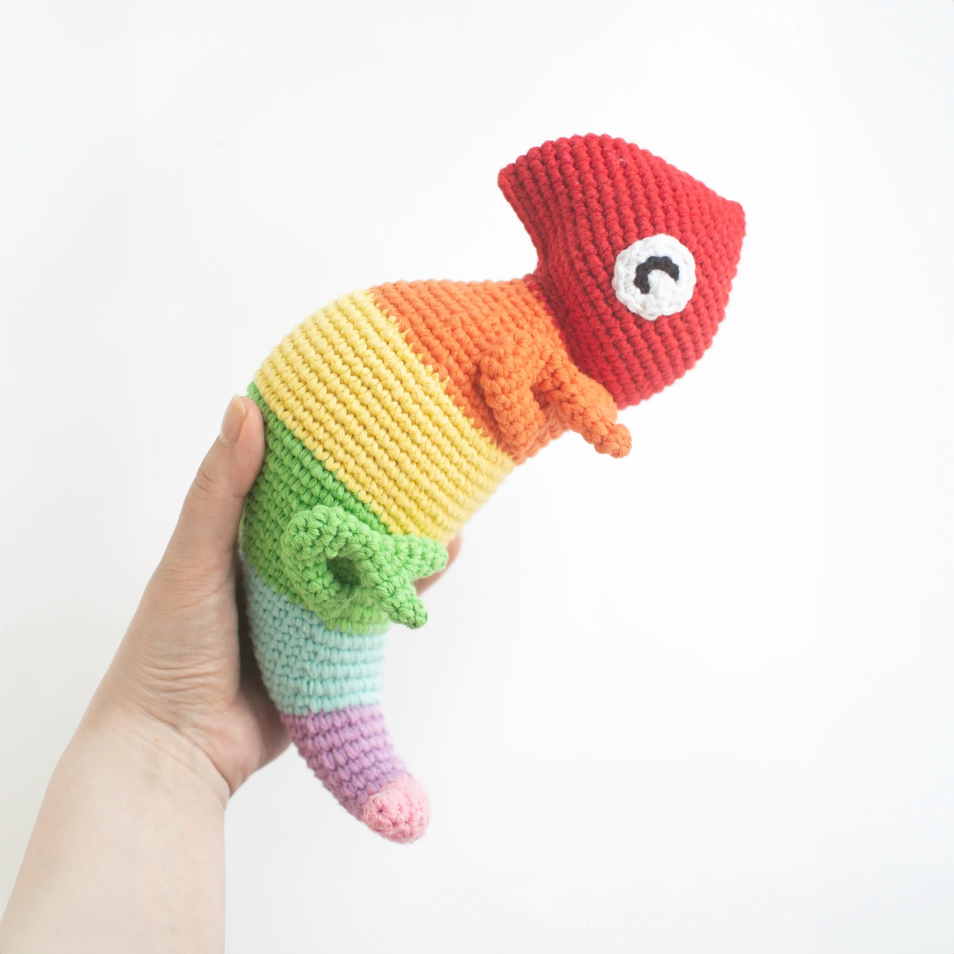 Crochet your own adorable amigurumi rainbow chameleon with this printable PDF crochet pattern. Cam is a 22 cm (8.75") long colourful chameleon with a curly tail and a pair of happy eyes.