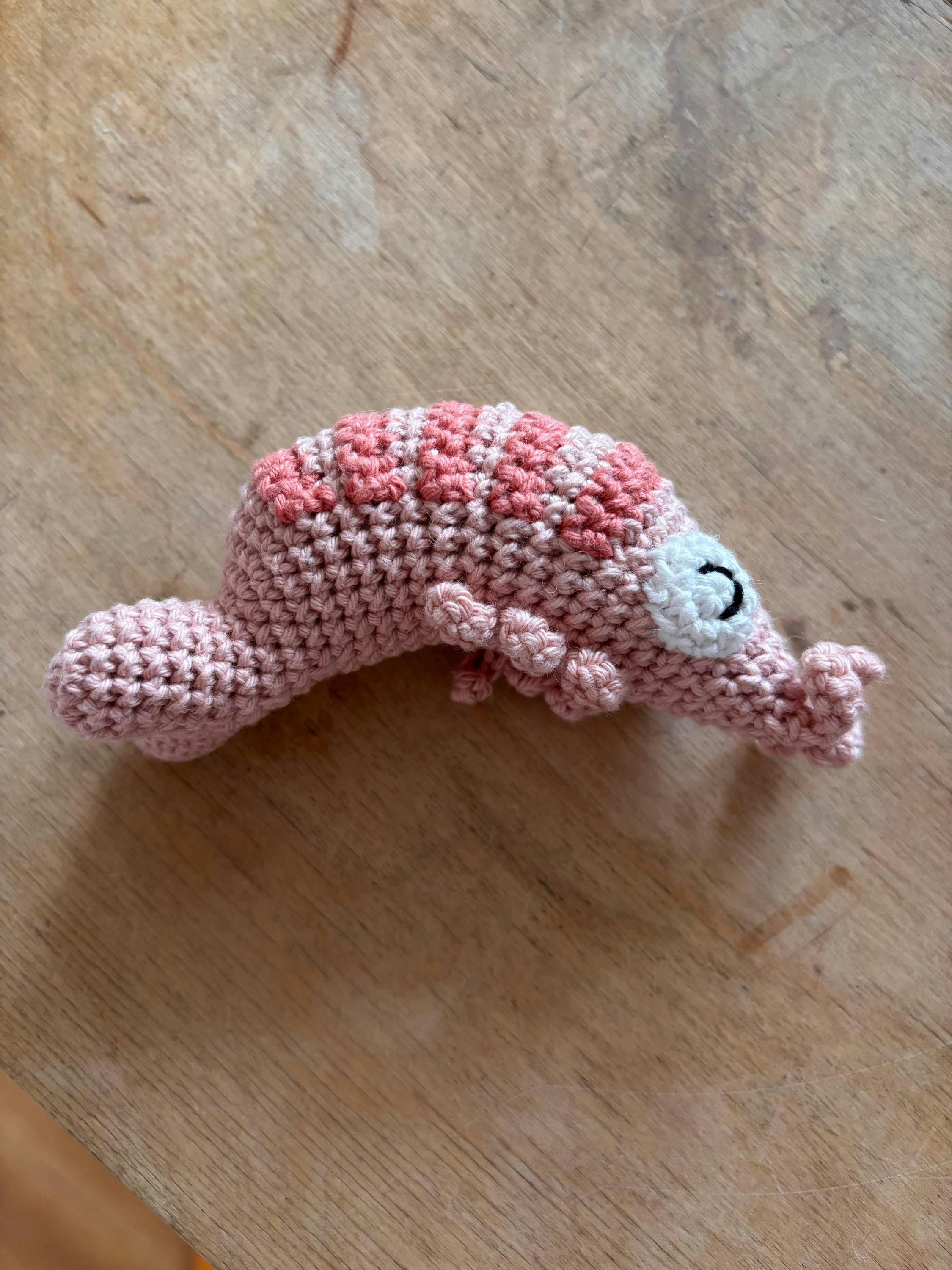 Crochet your own adorable little shrimp with this printable PDF crochet pattern. Ruth is a 10 cm (4") long peachy pink shrimp with a striped body and a pair of happy eyes. Ruth is crocheted with organic cotton yarn and a 3.00 mm crochet hook.