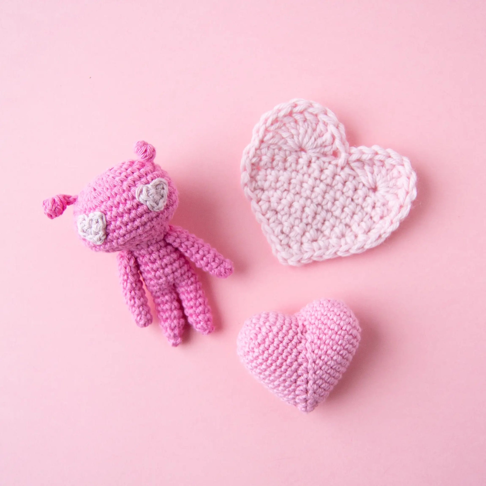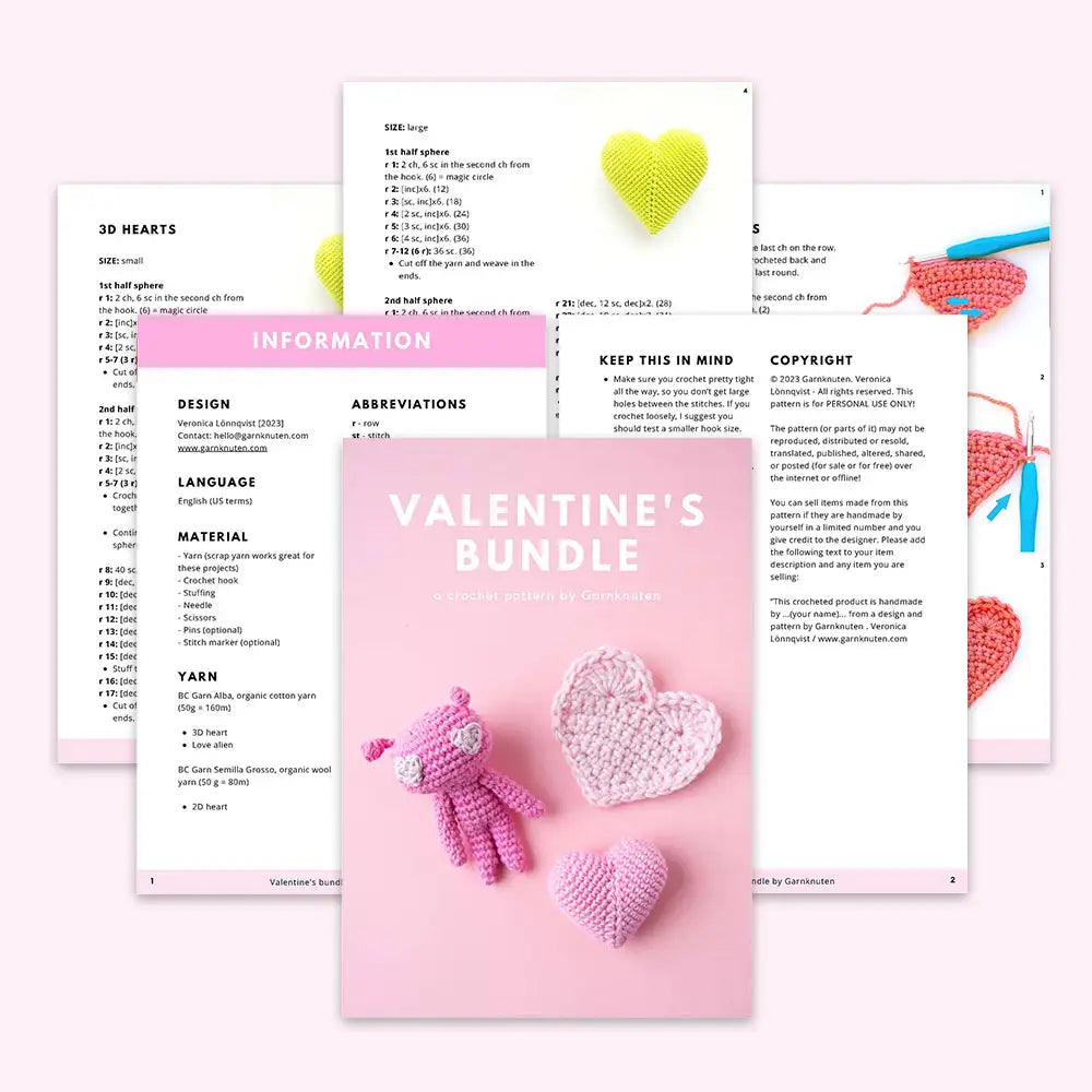 Crochet your own adorable Valentine's day themed amigurumi with this downloadable crochet pattern bundle for the highly popular 3D heart, 2D heart, and Love alien. These amigurumi make the perfect gifts around Valentine's day and other occasions.